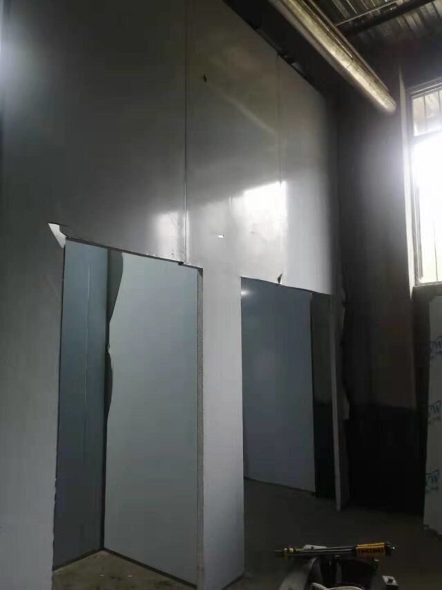 四川升鐘湖久全食品有限公司廠房裝修現場:立墻板,墻板打膠條,地槽施工中