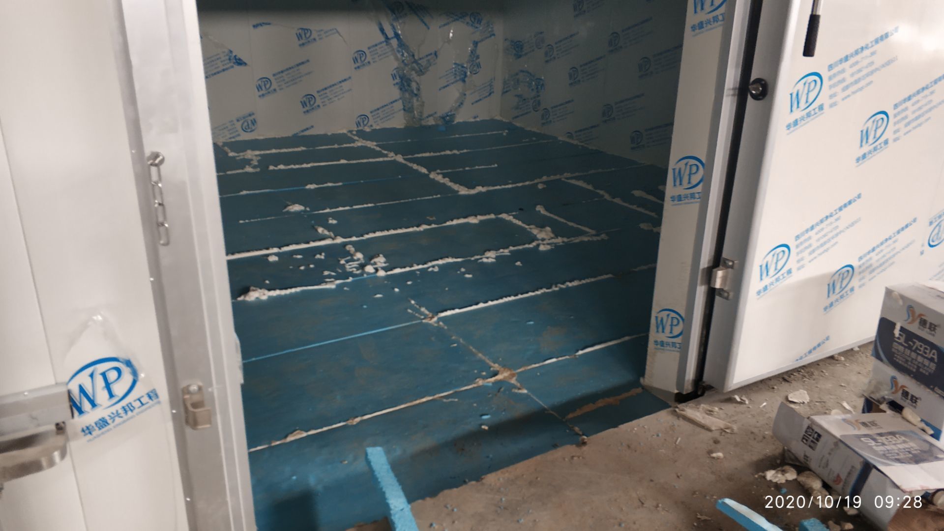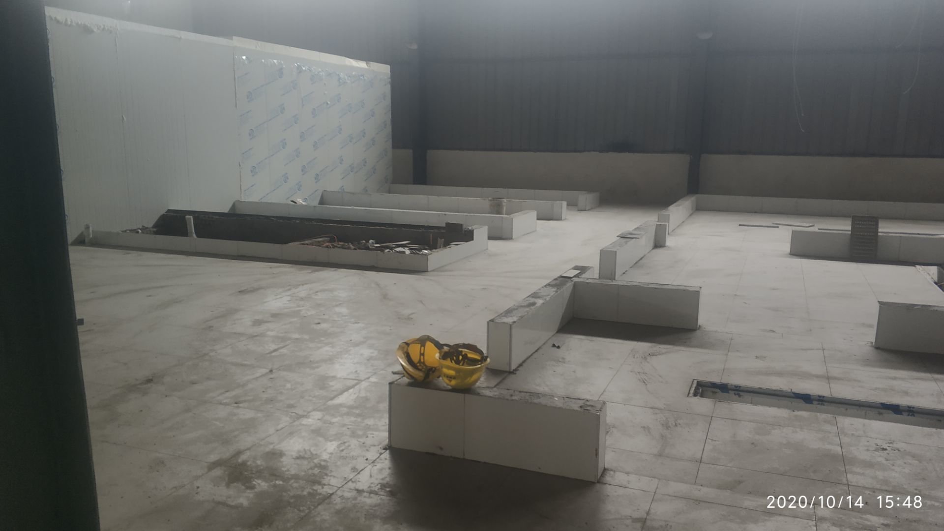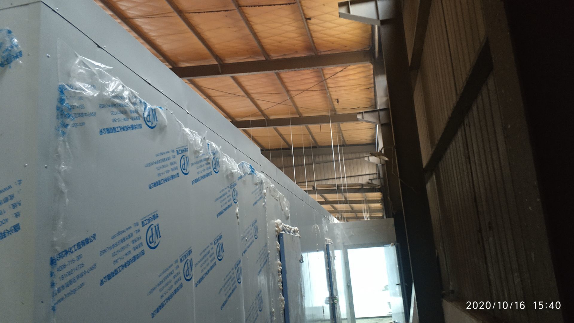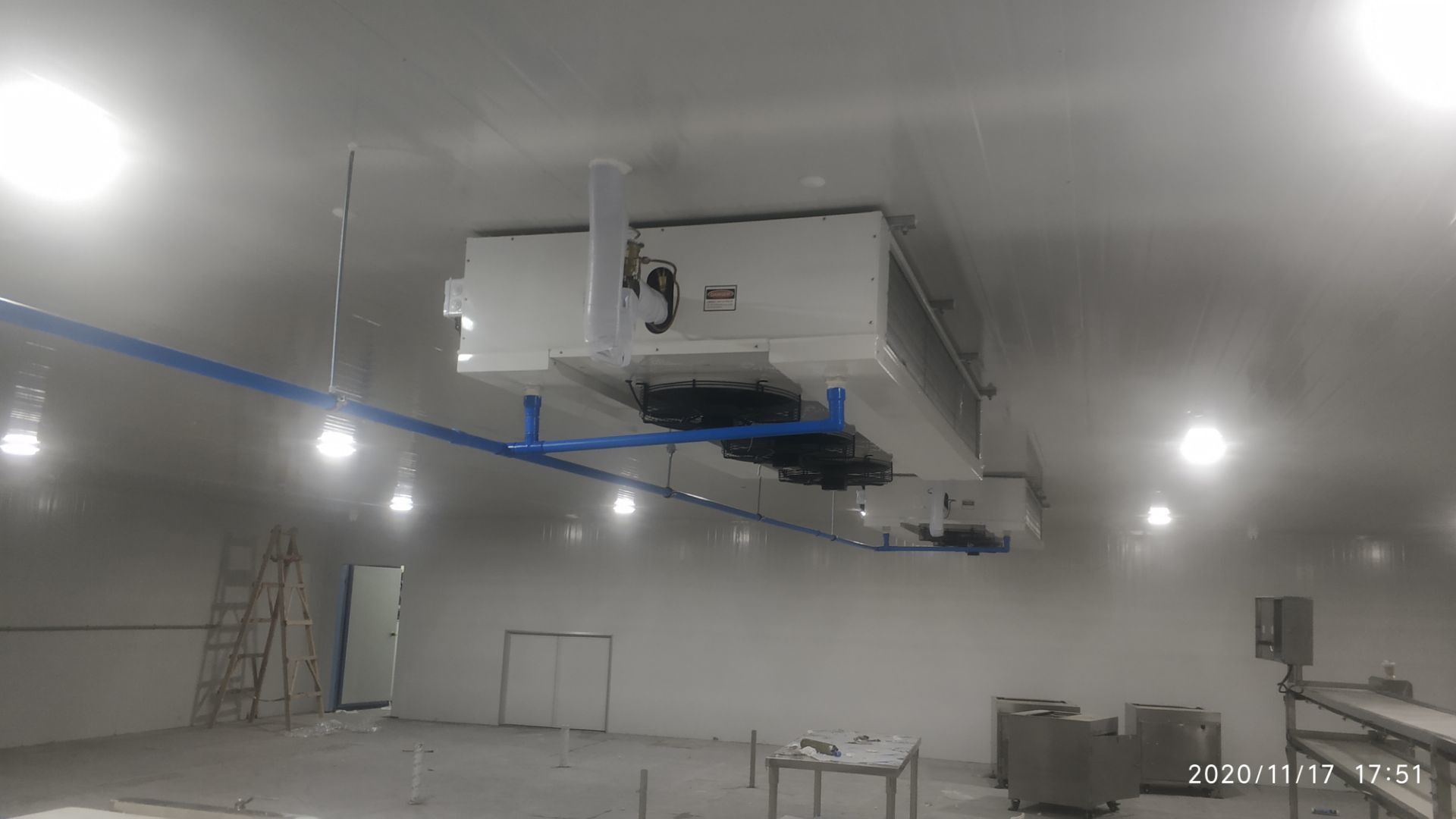 1.地面打磨完成分揀區域和后勤庫房。2.彩鋼組收邊收口,安裝門完成百分之八十。3.照明插座布線安裝完成百分之八十五。 4.凍庫內機組安裝完成。 5.卷簾門安裝完成。
