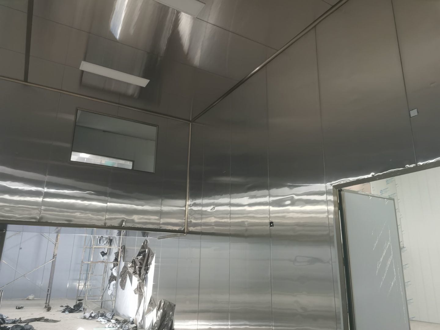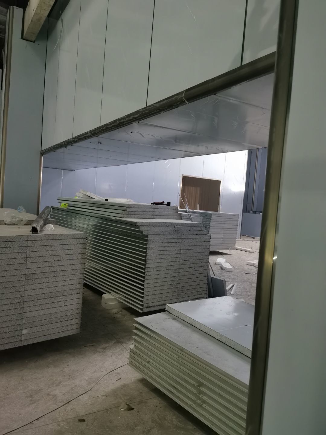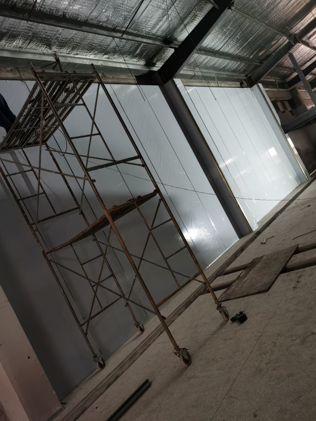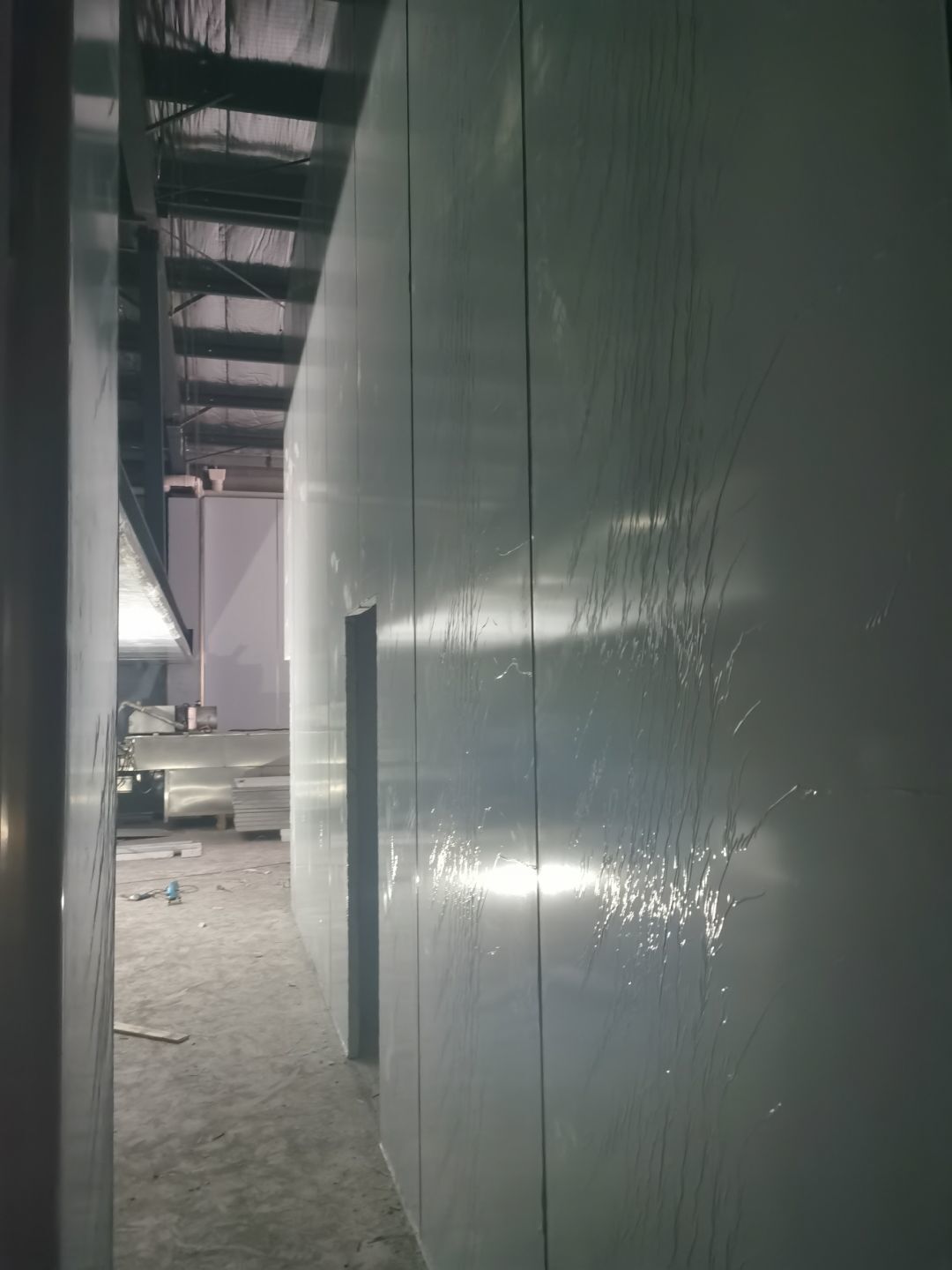 1、鋼接構完成70%;2、凍庫完成100%;3、彩鋼板開始立墻板