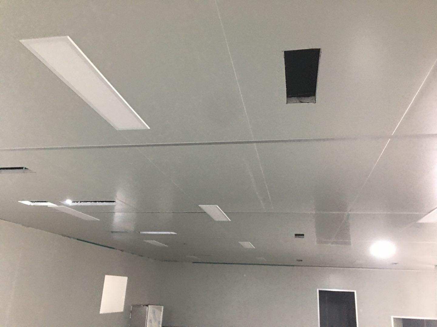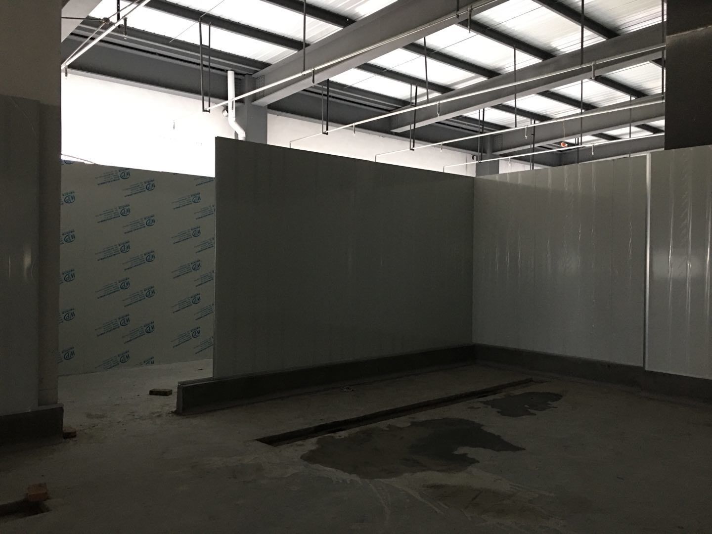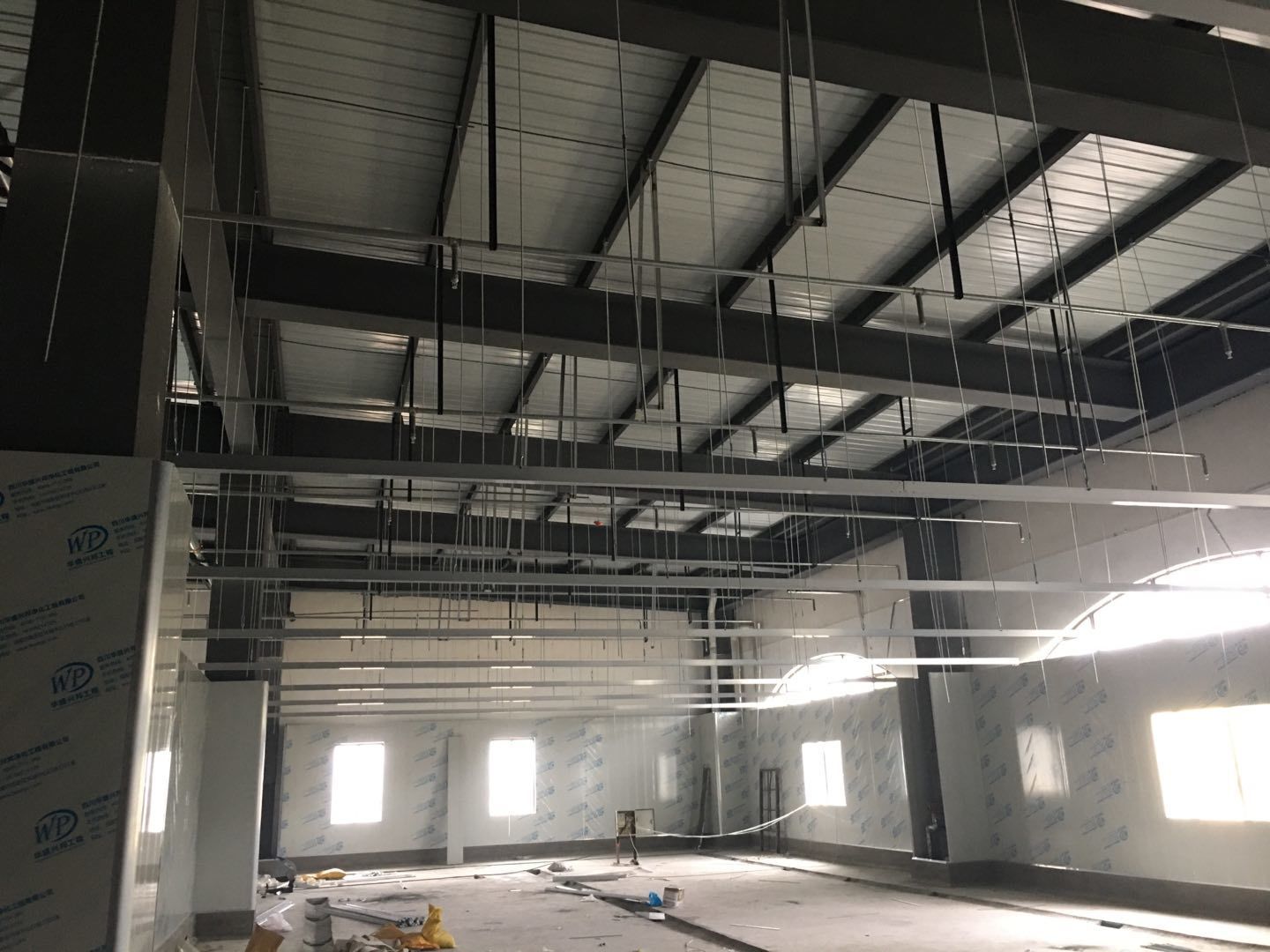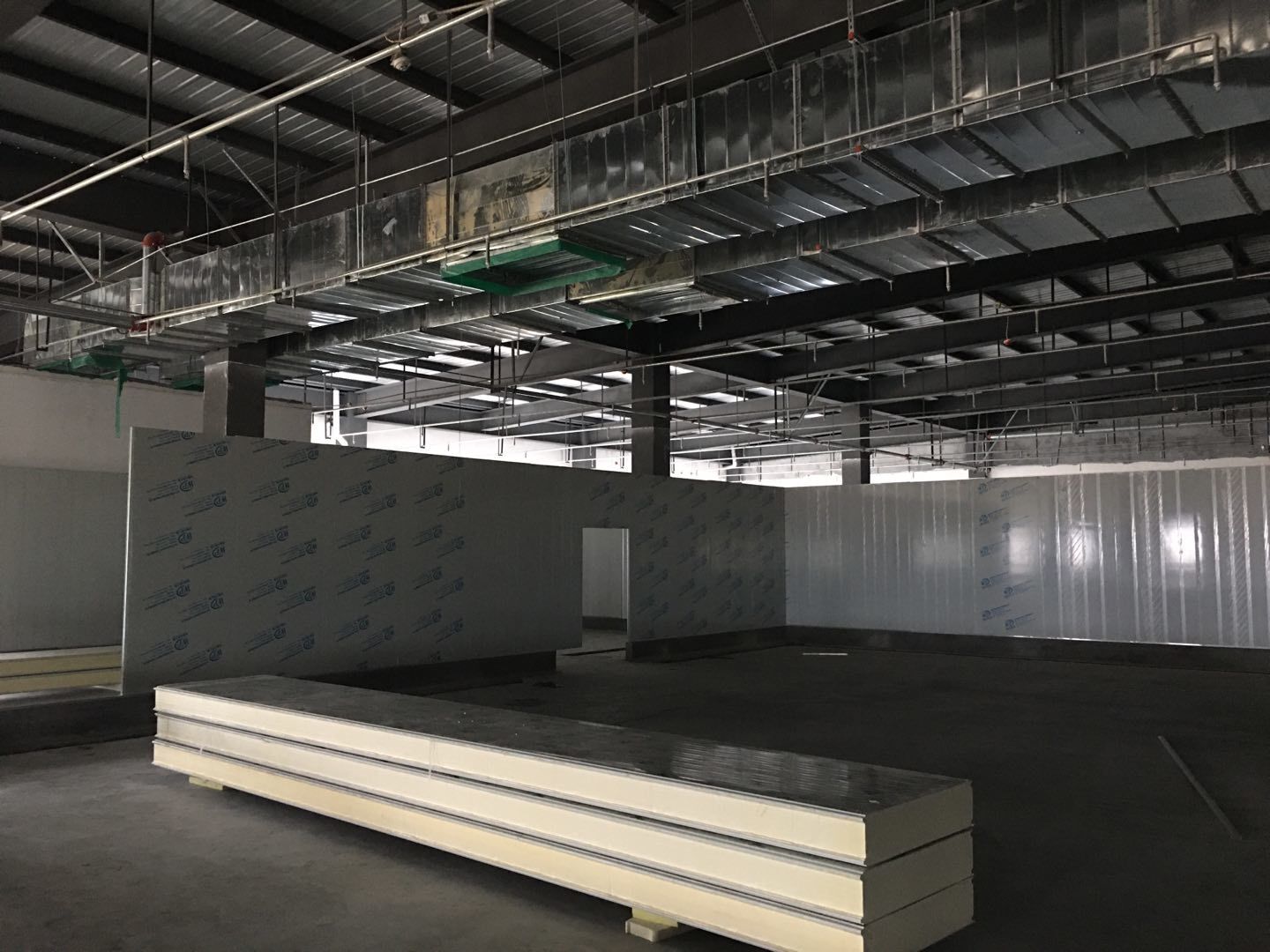 1.簽證彩板內包材庫未封頂,門窗已投合,明日開始全面開預留孔2.空調班組、風盤絲桿支架固定,管道布置焊接。3.水電班組-燈具安裝,配線配管。全部燈具安裝完成。