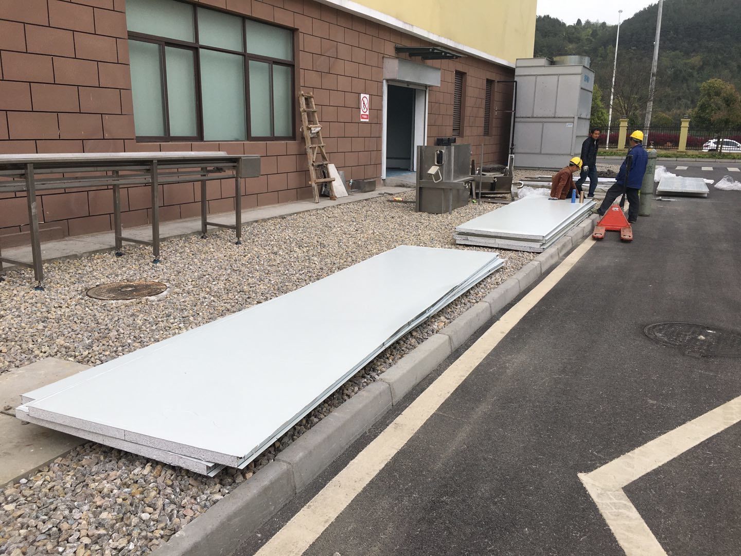 1:彩板吊頂全部門框扣料完成,門板構件同步制作中。收尾工作分區域暫進行配合地坪施工。2:空調班組~風管合縫完成,完成材料轉運至二樓,主機設備到場卸裝。3:水電班組-控制線配線完成80%,樓頂配管20%左右。