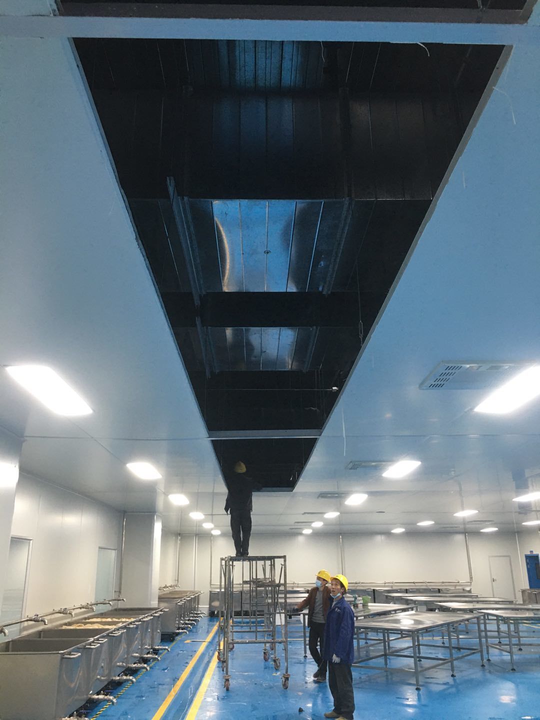 1:彩板班組~收尾工作進度50%左右。2:空調班組~主要設備及風道均已吊裝完成。剩余工作:主機配管,配線調試,安裝風口。3:水電班組-空調電源配線完成約35%,剩余工作:動力電施工,吊頂到給水點位的不銹鋼管施工,配電箱安裝調試。