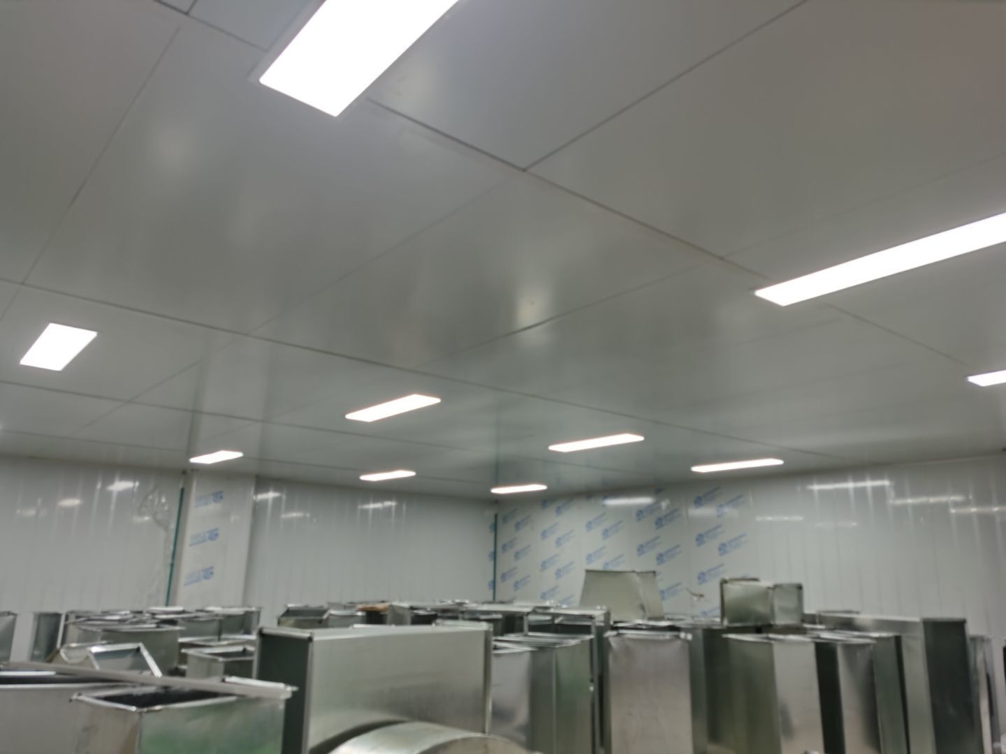 1,彩鋼墻板立板除預留設備外完成100% 2,彩鋼板吊頂除預留外,完成95% 3,三防板吊頂完成100% 4,水電安裝完成60% 5,彩鋼板收尾工作完成30%
