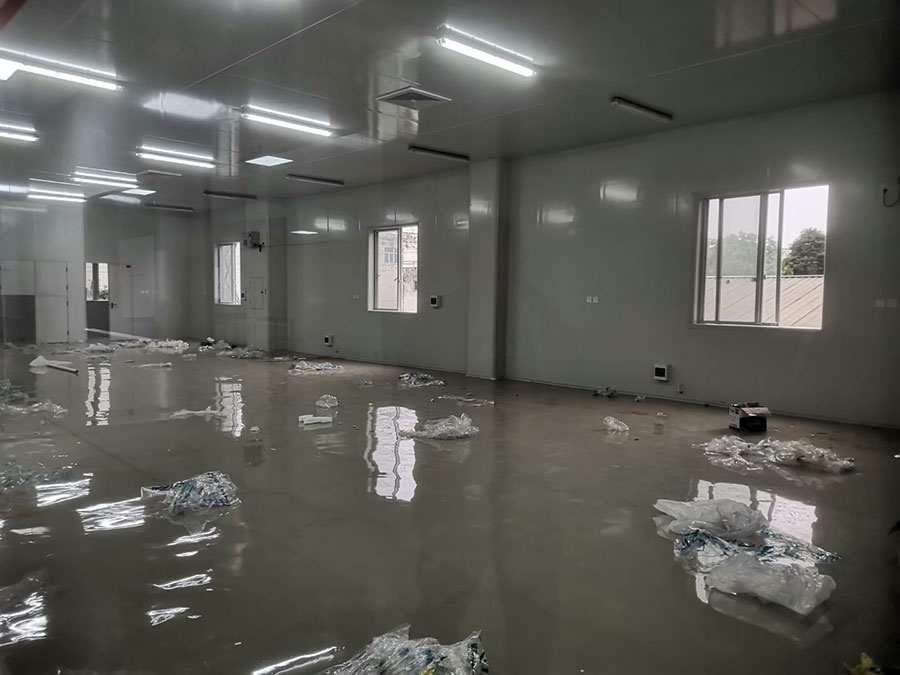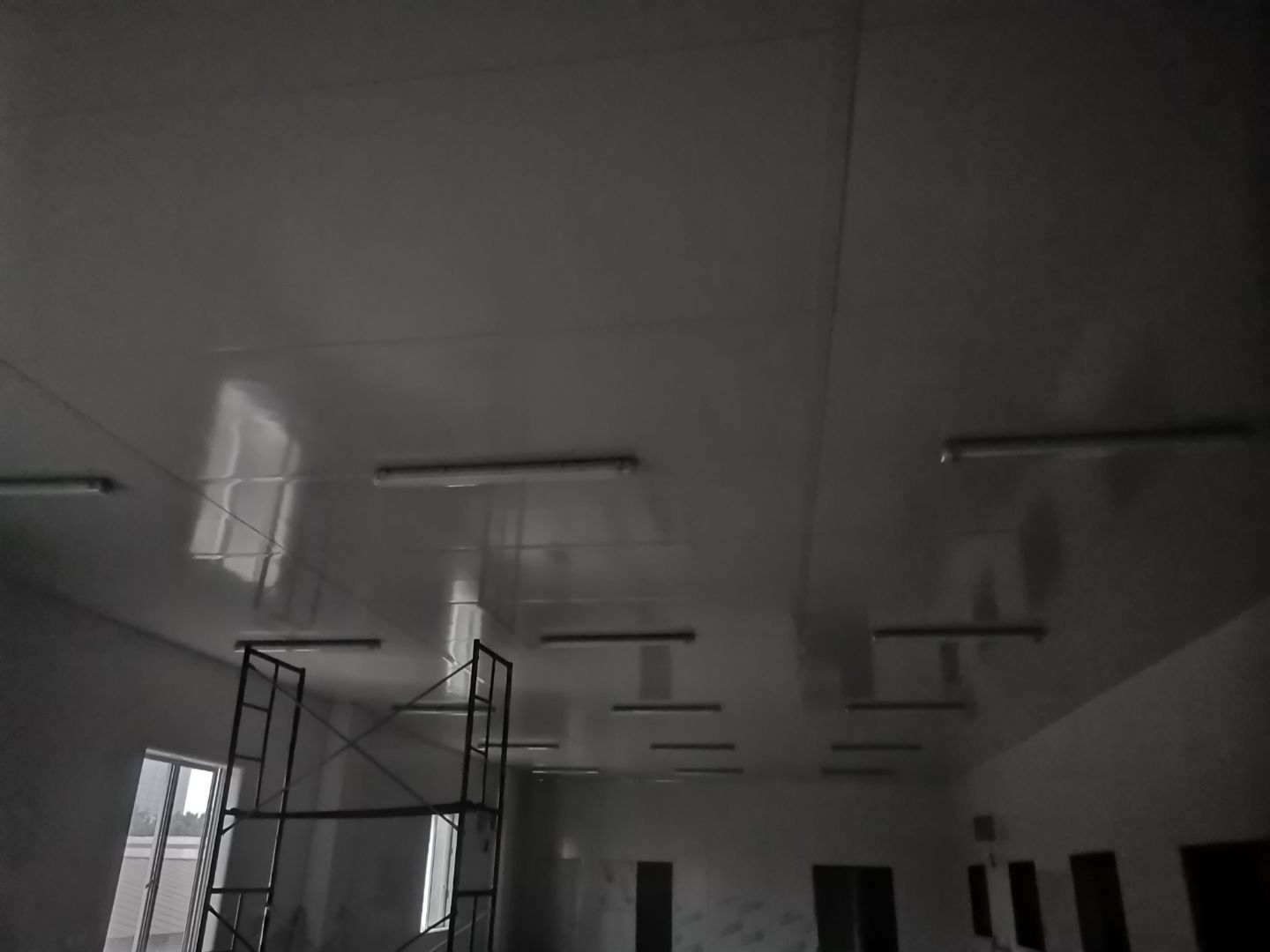 1.頂板安裝完成100%; 2.三防板吊頂完成100%; 3.水電安裝完成90%,燈具安裝完成95%; 4.新增動力電完成90%; 5.衛生間隔墻完成100%; 6.腳踏池完成100%; 7.風淋室制作完成90%; 8.地坪膩子層完成80%; 9.場地清理。