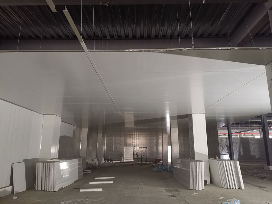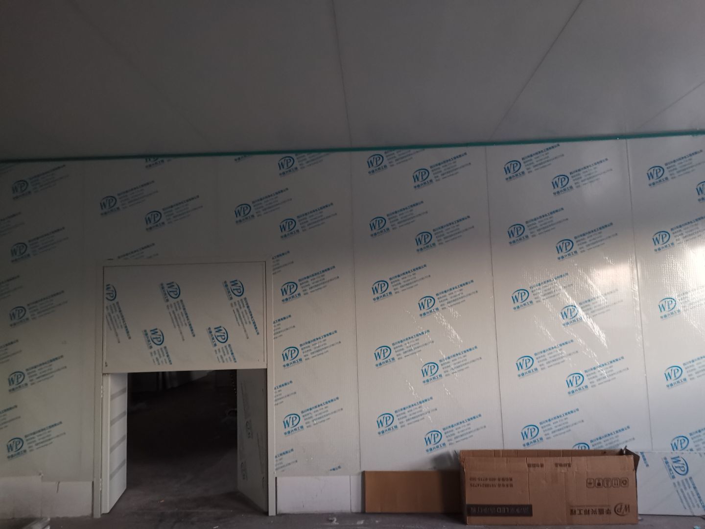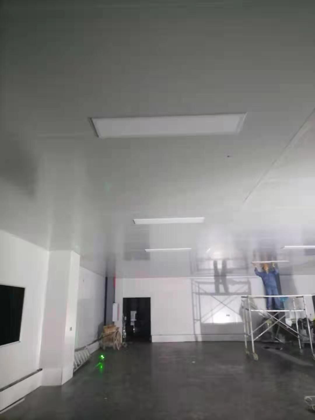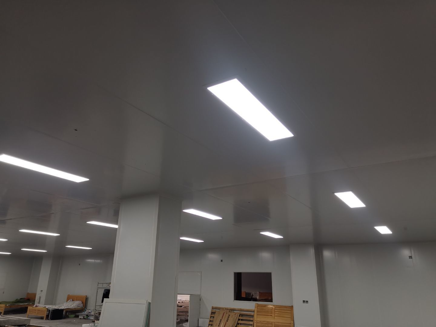 1、材料三防板到貨 2、彩鋼工程打膠安裝圓弧完成總體50% 3、LED平板燈安裝完成總體70%